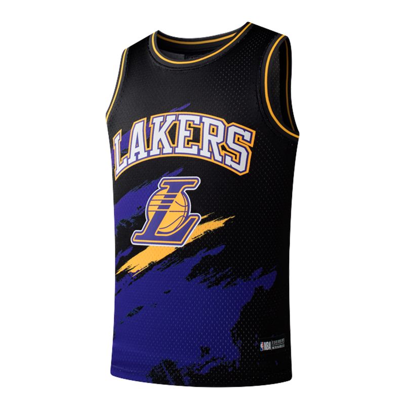 • Diseño Gráfico: Estampado frontal con tipografía "Lakers" estilizada y fondo de pinceladas abstractas.