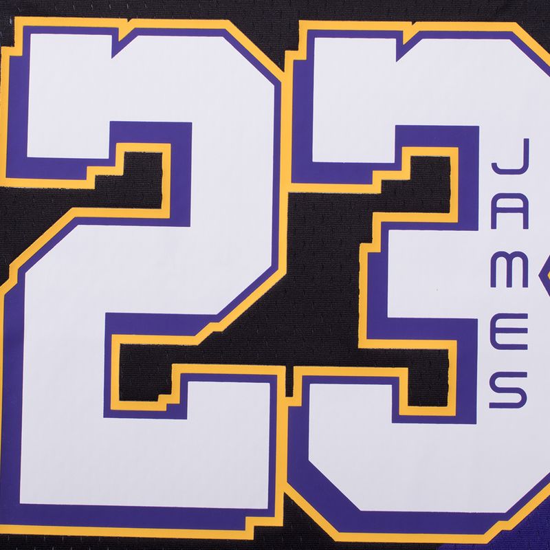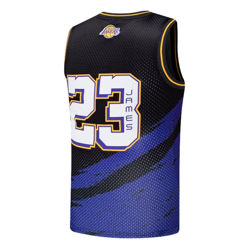 El estilo del Rey en las calles Esta musculosa lleva la identidad de los Lakers a un terreno más urbano y artístico. Con una base negra y gráficos abstractos en púrpura y dorado, es una reinterpretación moderna de la clásica camiseta de juego. El detalle que se roba las miradas está en la espalda: el nombre "JAMES" aparece escrito verticalmente dentro del propio número 23, un sello de originalidad para destacar en cualquier cancha de asfalto.